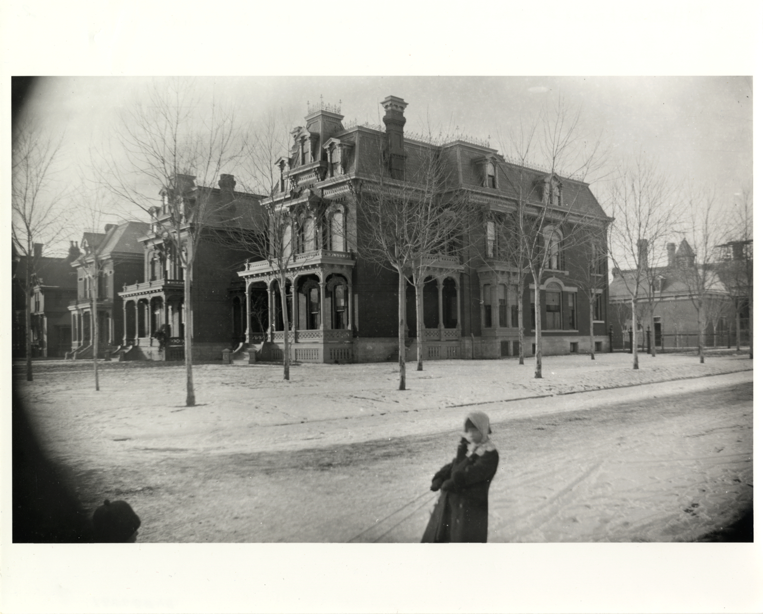 Front and side view of James A. Jones residence, located at 140 Canfield, during winter. Two-story Second Empire style house has mansard roof with cresting at roof line. Carriage house at rear of property. Handwritten on back: "140 Canfield."