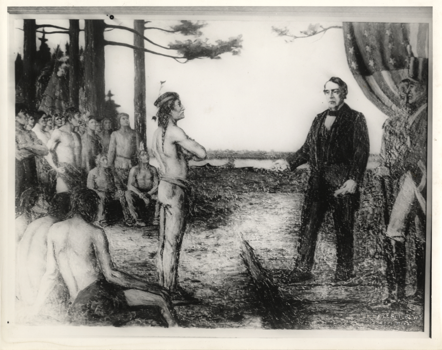 Artist's depiction of Lewis Cass meeting group of Native Americans in forest. Soldiers and American flag on right. Embossed on front: "The Detroit News, Detroit, Mich."