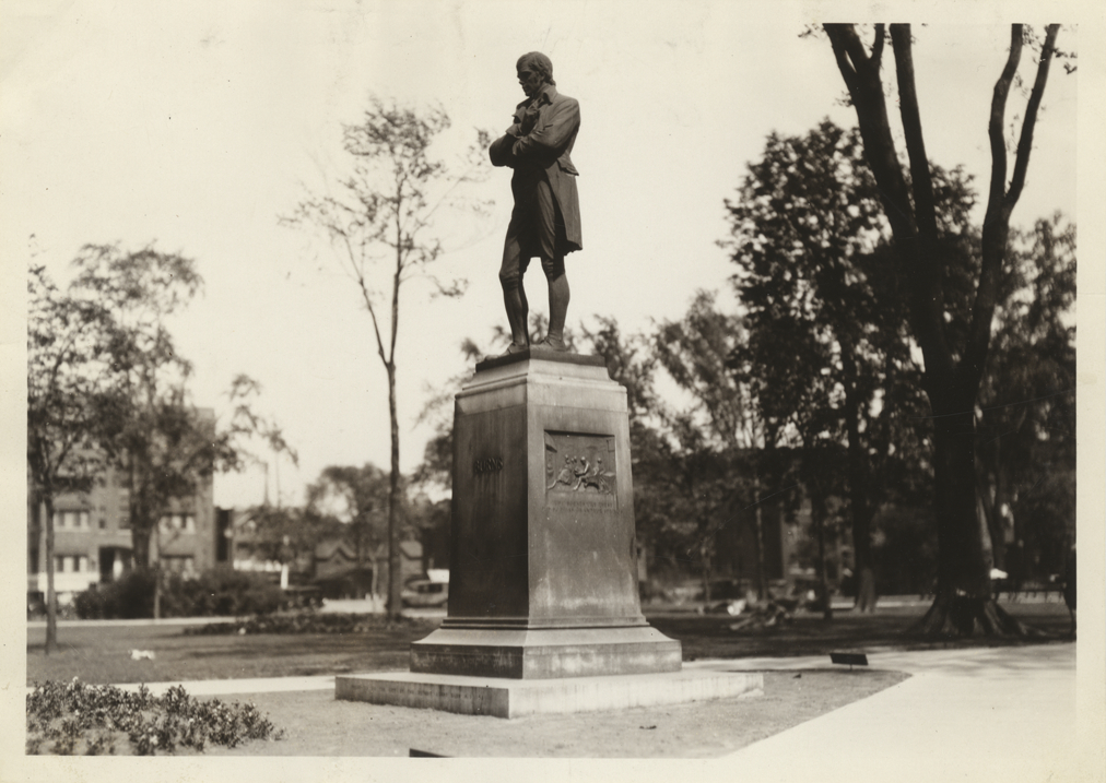 View of Robert Burns statue, located in Cass Park at Second Avenue. Monument was designed by George A. Lawson. Handwritten on back: "Robt. Burns statue, Cass Pk. at 2nd, 6-15-29."