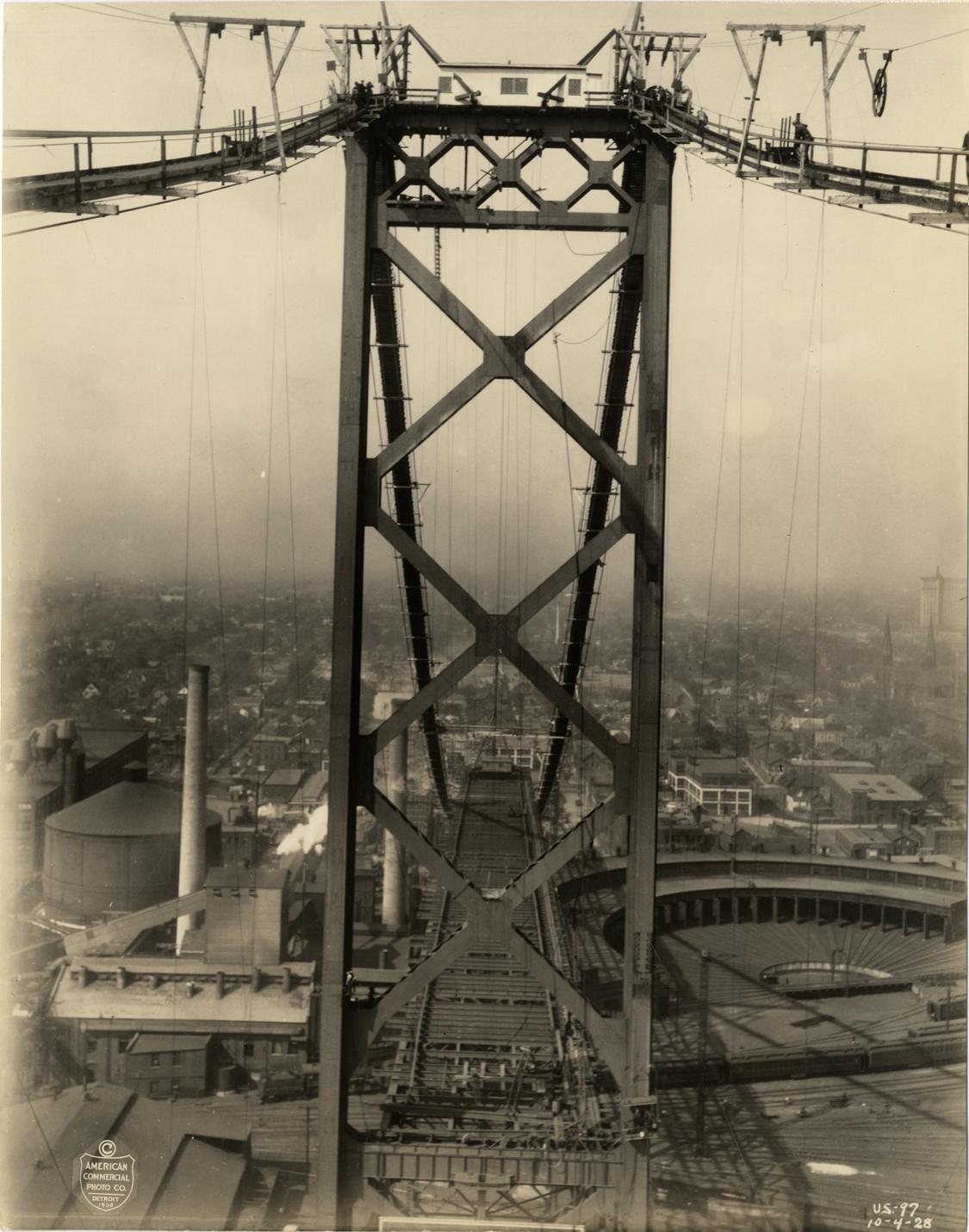 Close-up view of the Ambassador Bridge during construction. Bird's-eye view of Detroit below. Printed on front: "[copyright] American Commercial Photo Co., Detroit, 1928. US-97, 10-4-28."