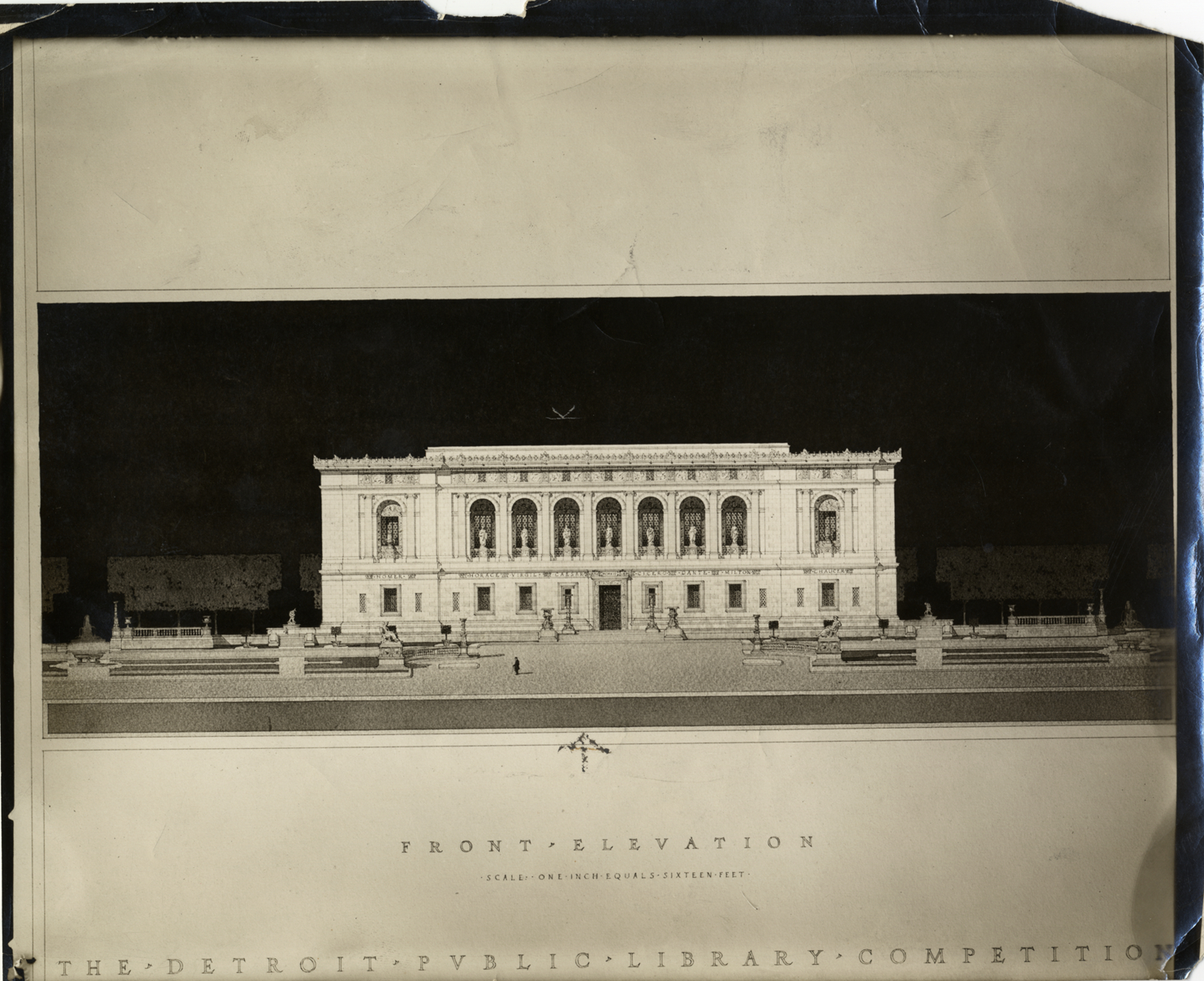 Architectural drawing of front elevation of Main Library, Detroit Public Library, created for the Detroit Public Library design competition. Printed on front: "Front elevation, scale one inch equals sixteen feet; the Detroit Public Library competition." Handwritten on back: "Facade."