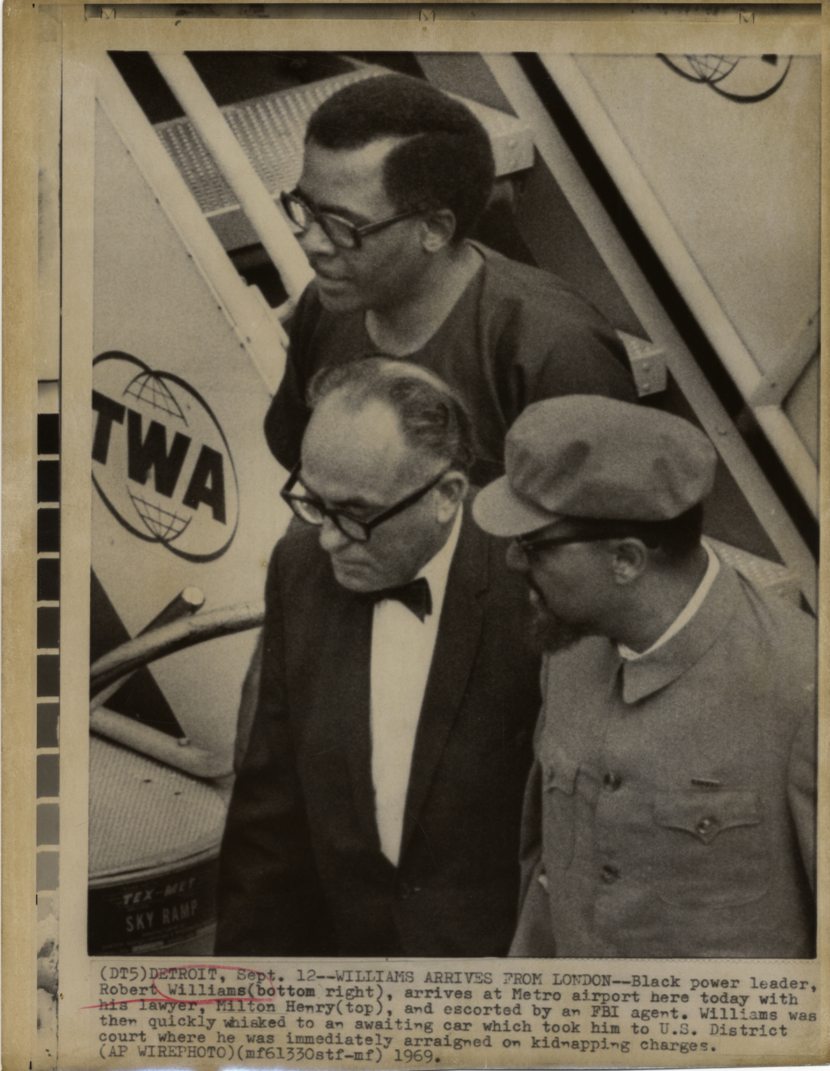 View of activist Robert F. Williams, his attorney Milton Henry and an FBI agent leaving TWA plane upon Williams' return to the United States via Detroit, Michigan. Printed on front: "(DT5) Detroit, Sept. 12. Williams arrives from London. Black power leader, Robert Williams (bottom right), arrives at Metro airport here today with his lawyer, Milton Henry (top), and escorted by an FBI agent. Williams was then quickly whisked to an awaiting car which took him to U.S. District Court where he was immediately arraigned on kidnapping charges. (AP Wirephoto) (mf61330stf-mf), 1969."