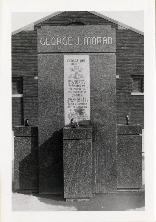 View of the George Jay Moran Memorial Fountain, located at Northwestern Field. Inscription reads: "George Jay Moran, born New York, N.Y., April 3, 1885, died Detroit, Mich., February 3, 1944. This memorial is gratefully dedicated by the people to the memory of 'Shorty' recognized by Detroit youth as their champion on the sandlots of this city, as a co-founder of Detroit Amateur Baseball Federation, he was president 1920-1944."