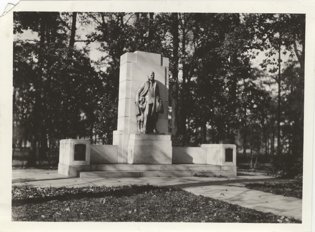 View of monument dedicated to James J. Brady, founder of the Old Newsboys Association, located on Belle Isle. Monument was designed by Samuel A. Cashwan and Fred O'Dell. Handwritten on back: "Brady Monument."