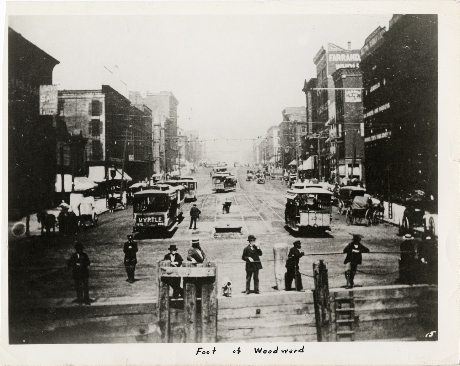 View of several streetcars near the foot of Woodward Ave. in Detroit. Several men lean against railing in foreground; commercial buildings in background. Handwritten on front: "Foot of Woodward."