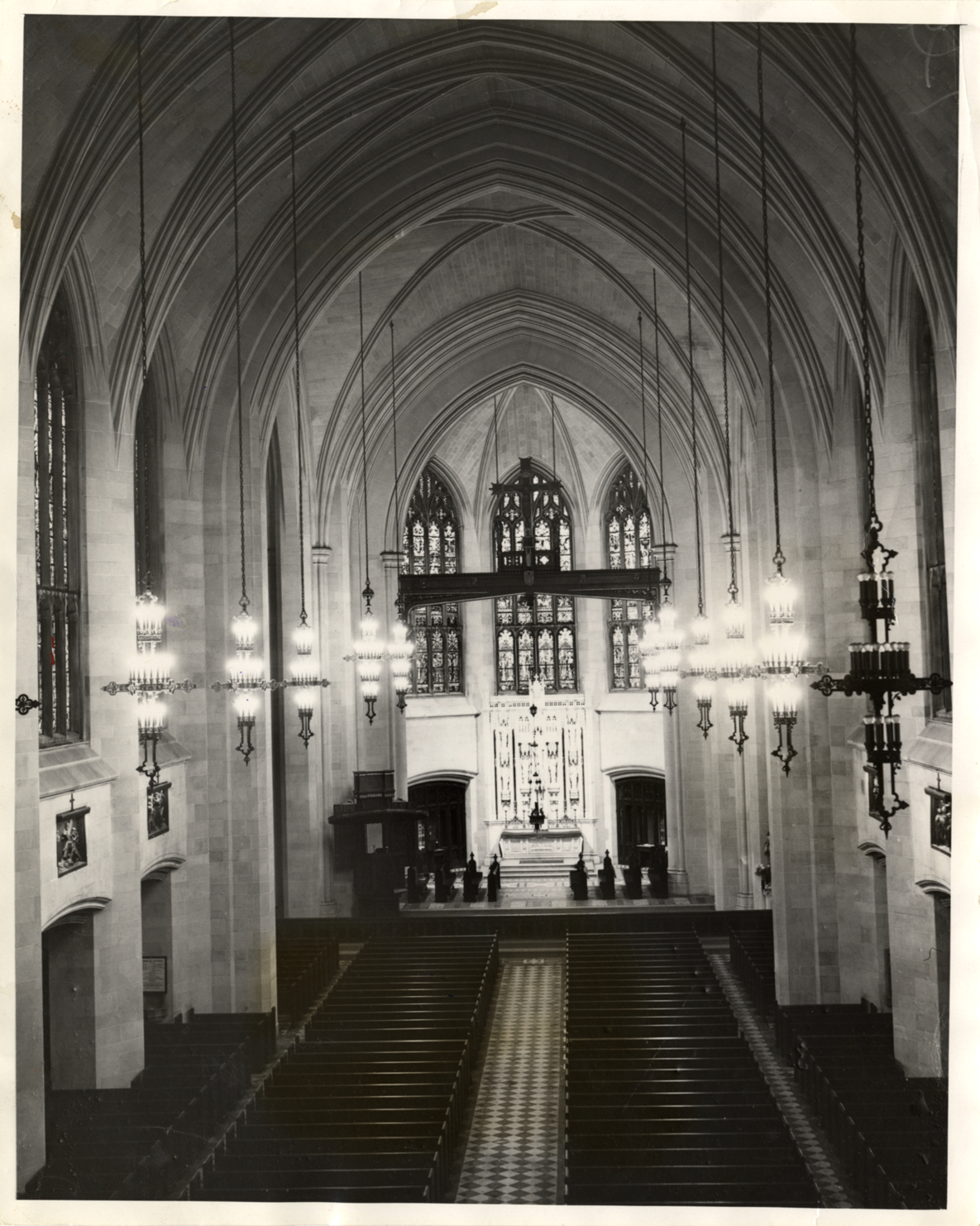 View of nave and apse in Blessed Sacrament Cathedral, showing stained glass windows, pews, vaulted ceiling and altar. Handwritten on back: "Churches, Blessed Sacrament, nave of church, Woodward & Belmont."