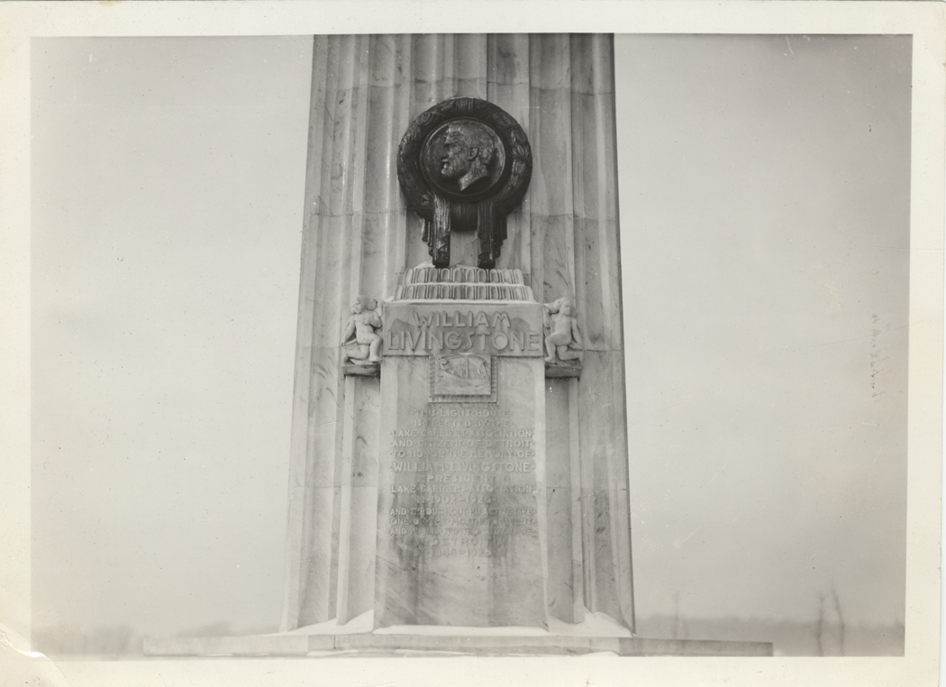 Close-up view of inscription and bronze medallion with portrait bust on the William Livingstone Lighthouse Memorial on Belle Isle. Monument was designed by Albert Kahn; sculptor was Gaza Moroti. Livingstone was the president of the Lake Carriers Association from 1902-1925.