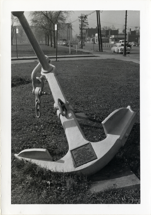 View of anchor from U.S.S. Yantic, installed on the lawn of the Naval Armory at 7600 East Jefferson Avenue. Inscription reads: "1864-1929, anchor from U.S.S. Yantic, built 1864, Philadelphia as Pres. Lincoln's yacht on Greeley Relief Expedition, active in three wars, 1897 training ship, 1922. Sank 1929 near this site after 65 years on the seven seas. This tablet placed June 26, 1936 by the Historic Memorials Society in Detroit, Michigan."
