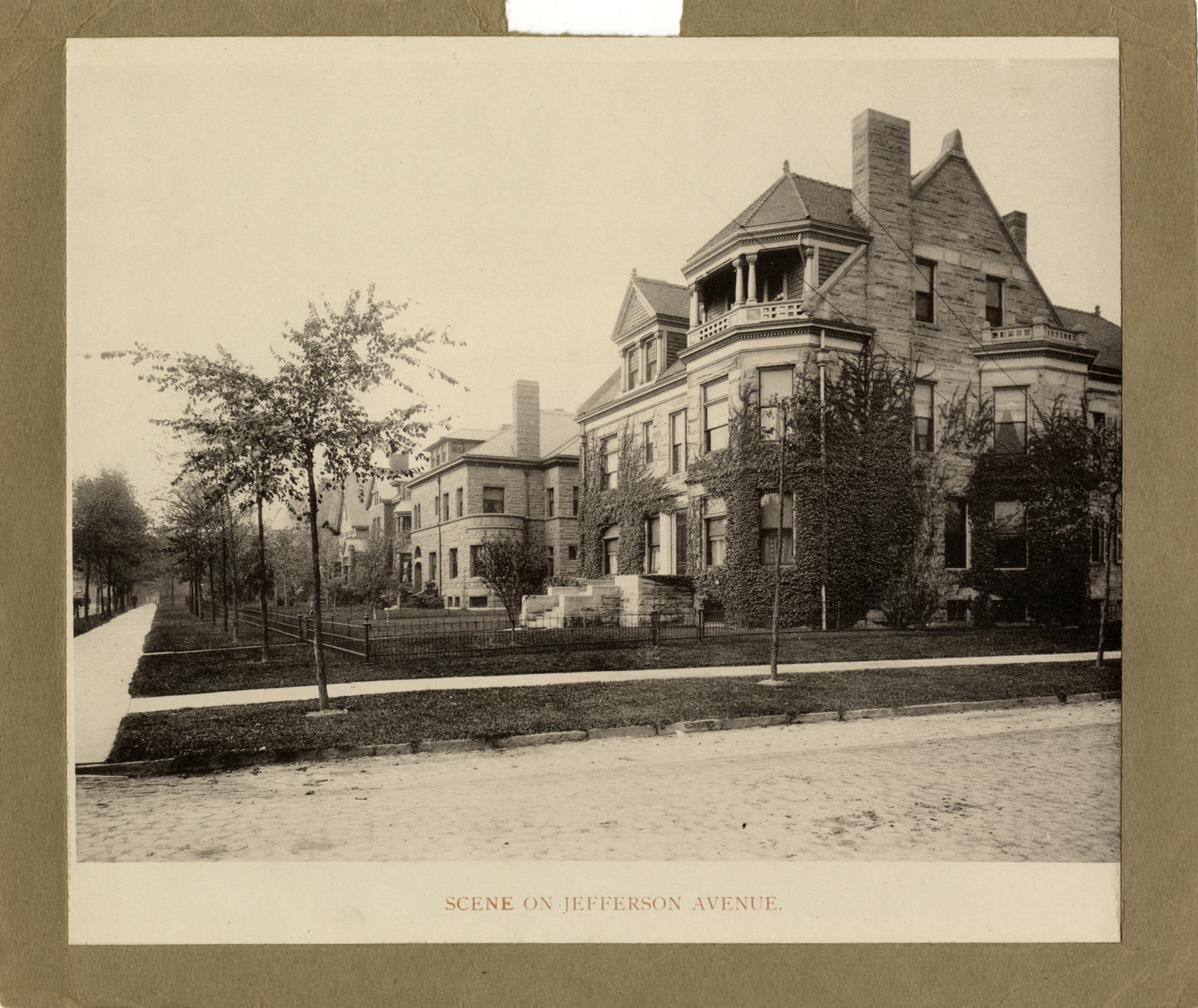 View of two-story ivy-covered stone house on northwest corner of Jefferson Ave. and McDougall Ave. Two-story stone house adjacent to residence in background. Wrought-iron fence borders properties. Printed on front: "Scene on Jefferson Avenue." Handwritten on back: "NW corner of McDougall Ave. Residence of Henry Russell, Henry A. Weitzel, George B. Green, Fannie E. Bell, Dr. G.A. Stockwell, William H. Wells, John N. Bagley. In: L977.4D4 H71, Holden, E.G. Art work of the story of Detroit."