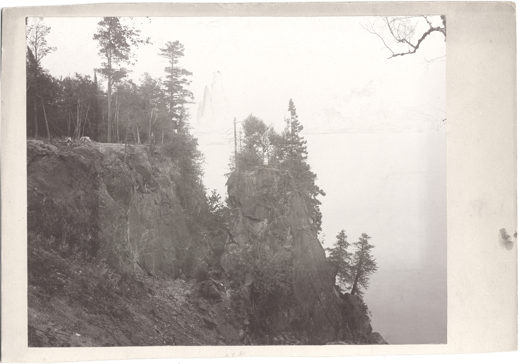 Man standing on cliff near Lake Superior shore. Embossed on photograph: "E.H. Husher & Co., Detroit." Handwritten on back: "Rock lsland Park, Marquette, 501."