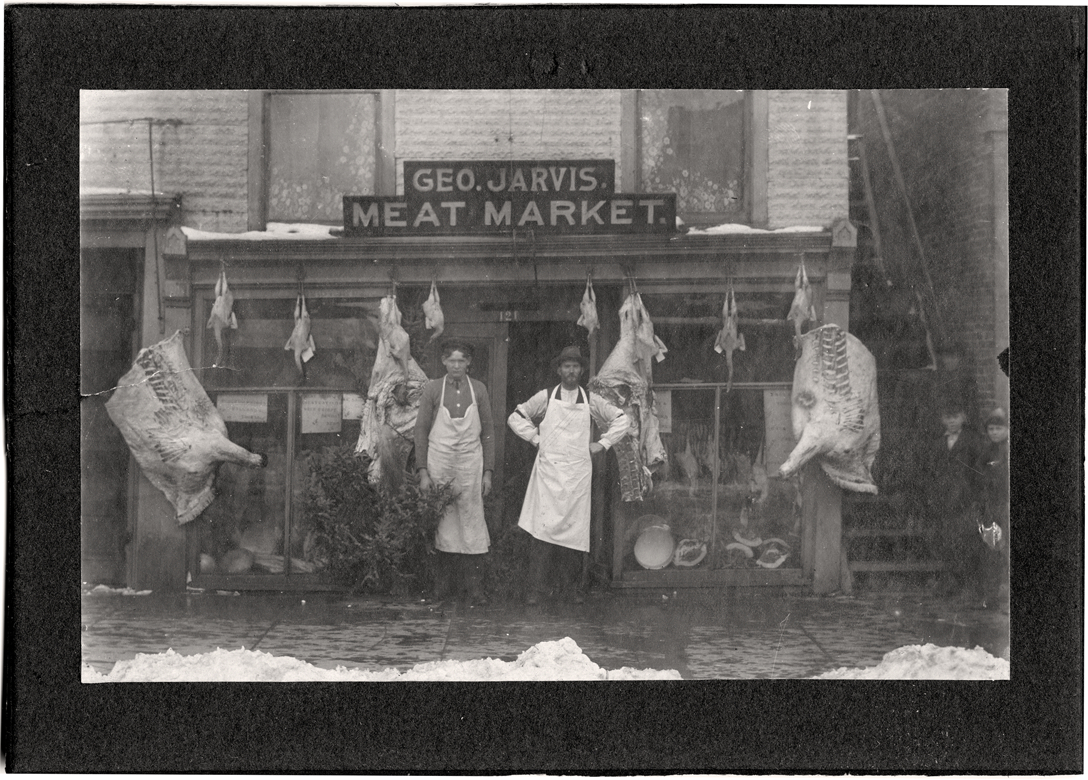Two aproned men standing in front of butcher shop with piled snow in front. Sign on building reads: "Geo. Jarvis / meat market." Handwritten on back: "Dec. 25, my own store in Corunna, Mich., Shaw Co., my son freezing, with Bldg., 1907 Anthony Stec(?)."