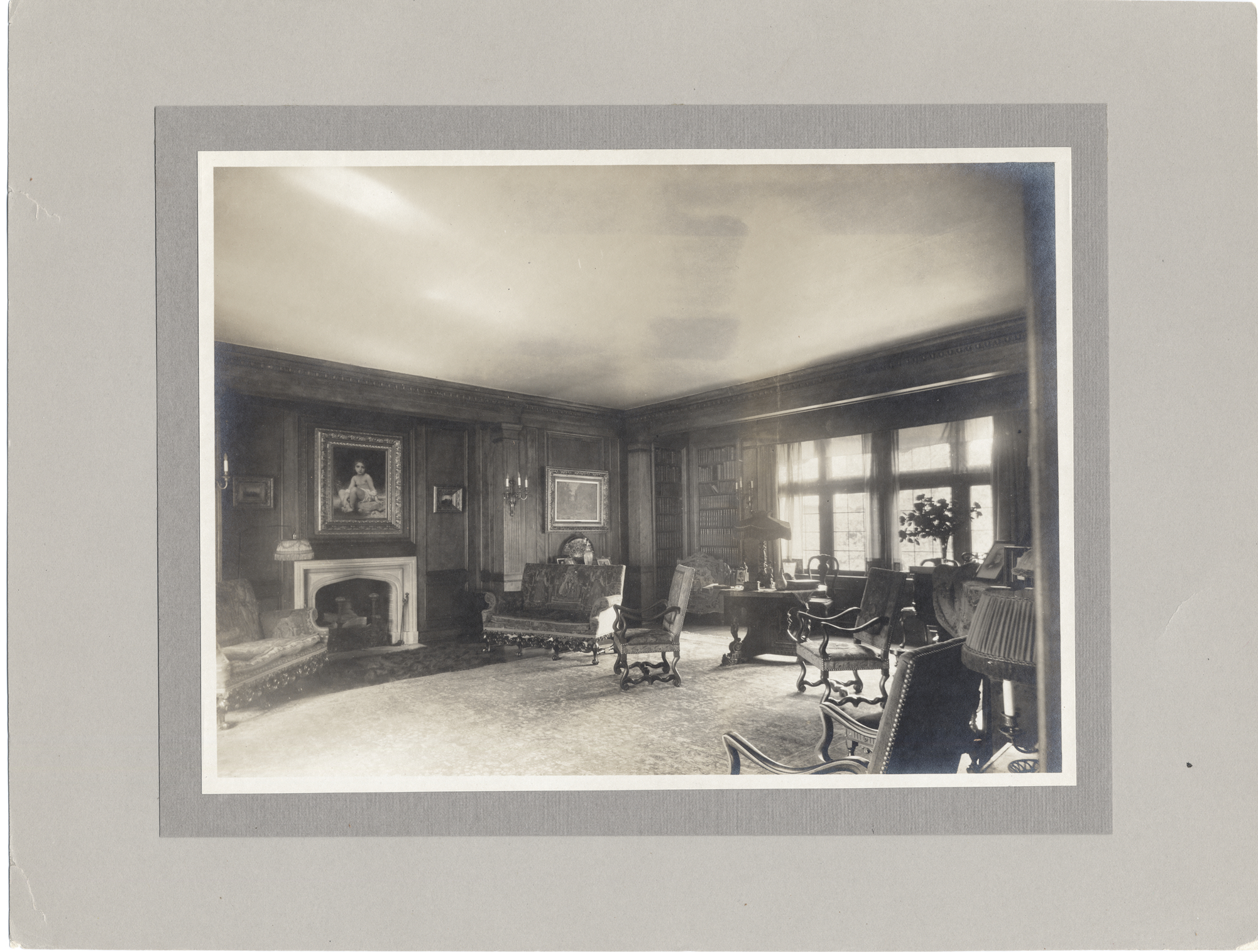 Paneled living room with fireplace, paintings on wall, bookcases, upholstered furniture. Four windows with bright light.