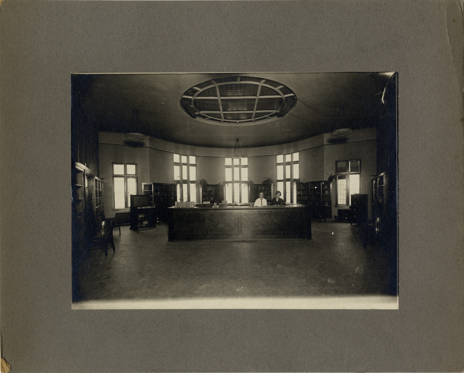 View of two librarians posing at reference desk in Osius Branch, Detroit Public Library. Bookcases and windows in background. The library was named after library commissioner George Osius. Handwritten on back: "1916."