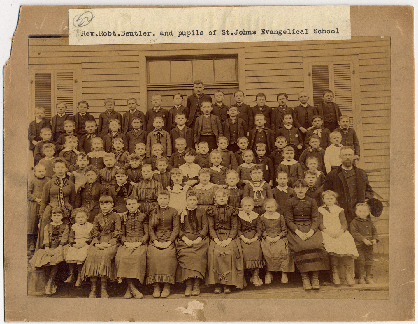 Group of children posed outside wood frame school building, with adult man standing at right. Typed on front of photo: "Rev. Robt. Beutler and pupils of St. Johns Evangelical School."