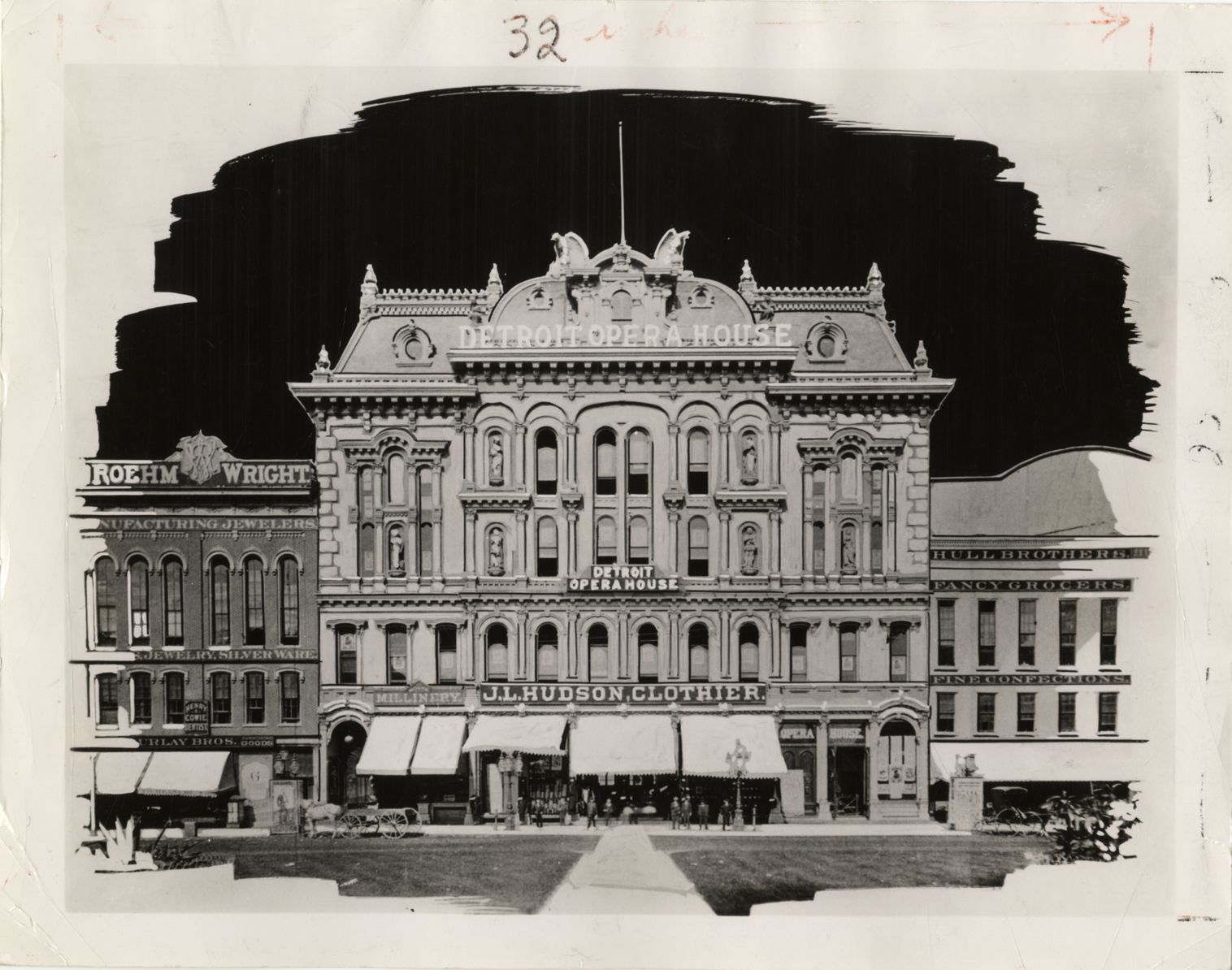 View of the J.L. Hudson Company store on the ground floor of the Detroit Opera House. Signs on building read: "J.L. Hudson, clothier" and "Detroit Opera House." Handwritten on back: "Hudson's Detroit Opera House store."