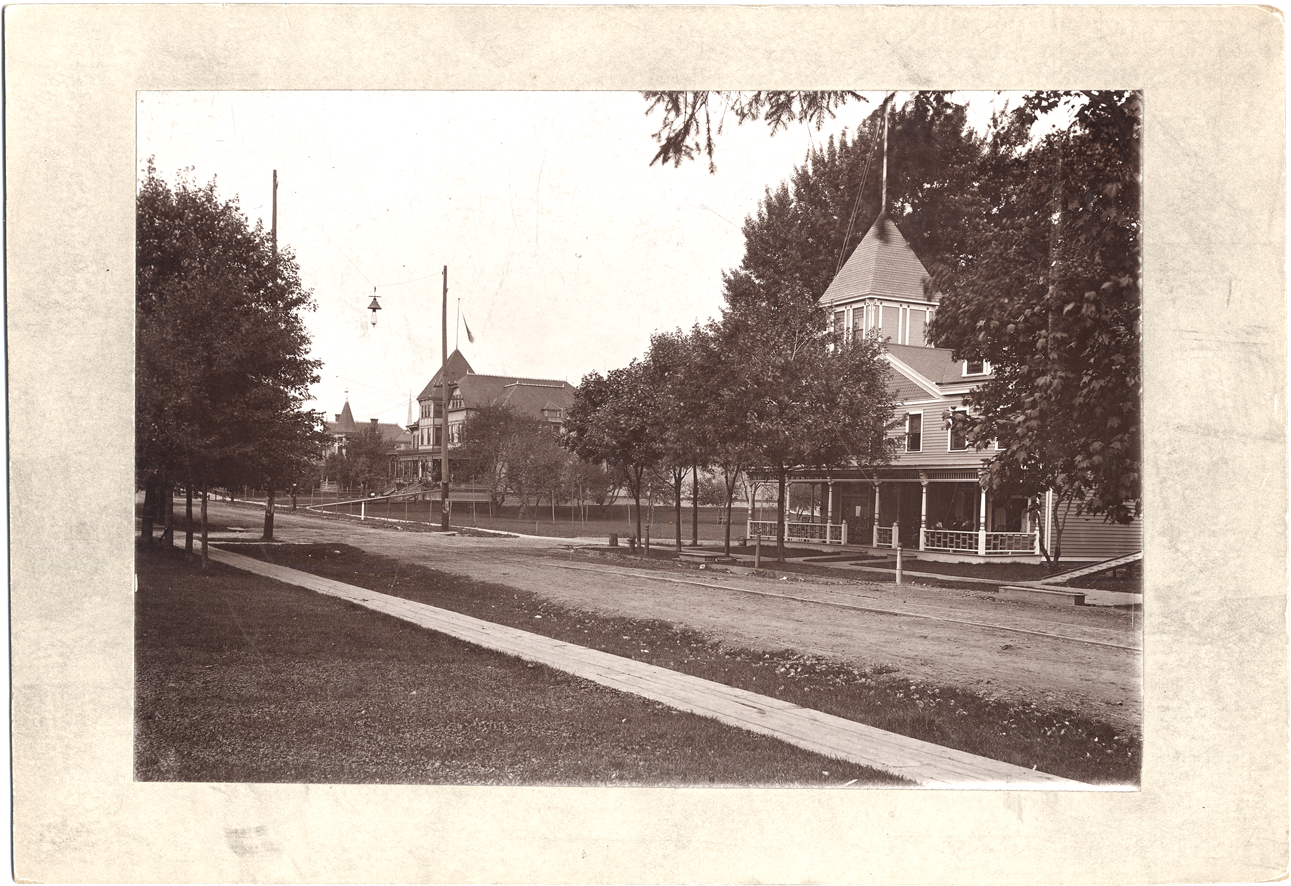 Gold Cure and Park House in Monroe, Michigan, a large two story wood frame building on rural road, with other buildings farther down the street. Written on photo back: "Monroe Gold Cure & Park House."