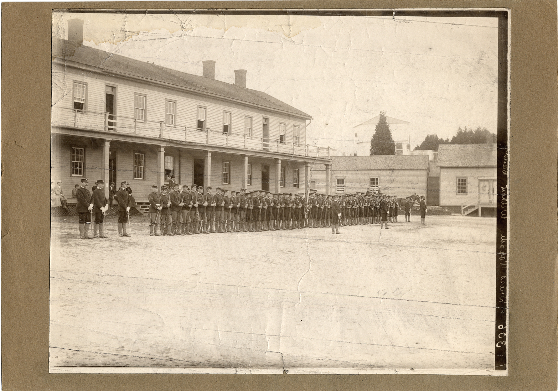 Parade ground in the fort. Soldiers and sailors in dress parade with observers at barracks building and in carriage. Written on negative, appears in reverse on photograph: "Dress parade without band."