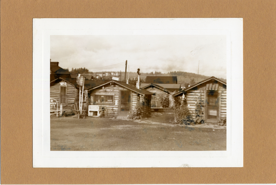 Close-packed rustic cabins. Handwritten on back: "Henry Ford's timber tract, Michigan, 1940."