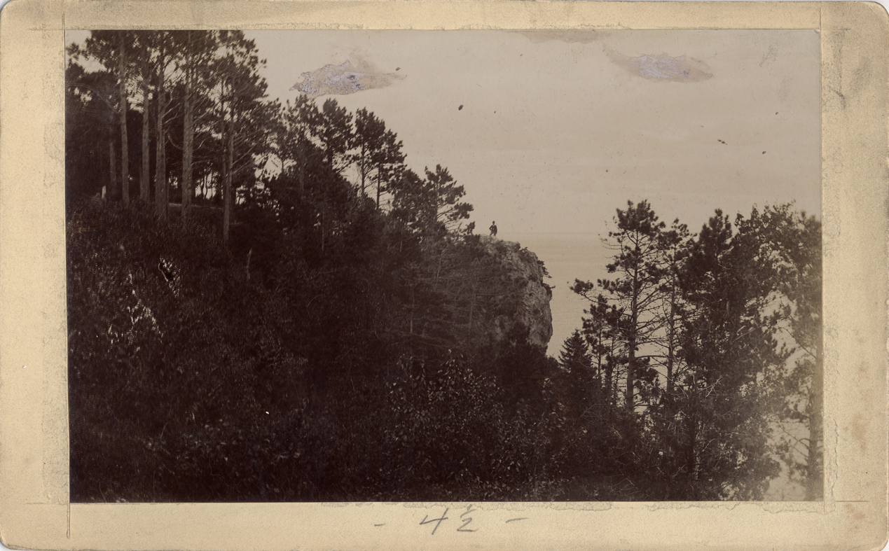 Robinson's Folly on Mackinac Island nearly obscured by trees. Written on back of cabinet card: "Robinson's Folly, Mackinaw."
