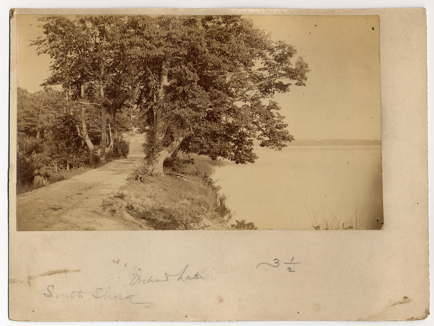View of unpaved road on lake shore. Handwritten on mat front: "Orchard Lake, south shore." Handwritten on mat back: "41939."