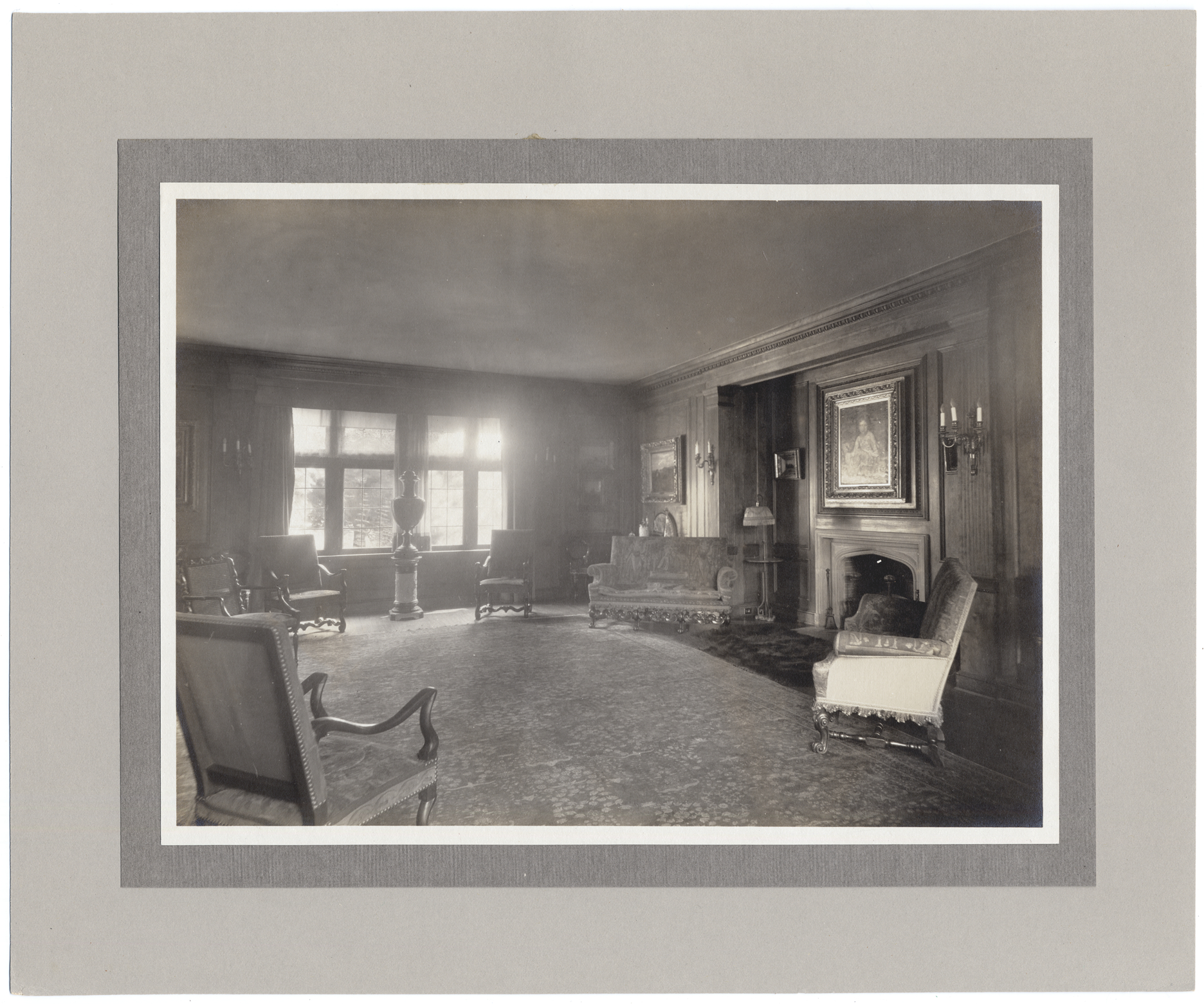 Paneled living room with portrait above fireplace, upholstered furniture, bright light in through windows.
