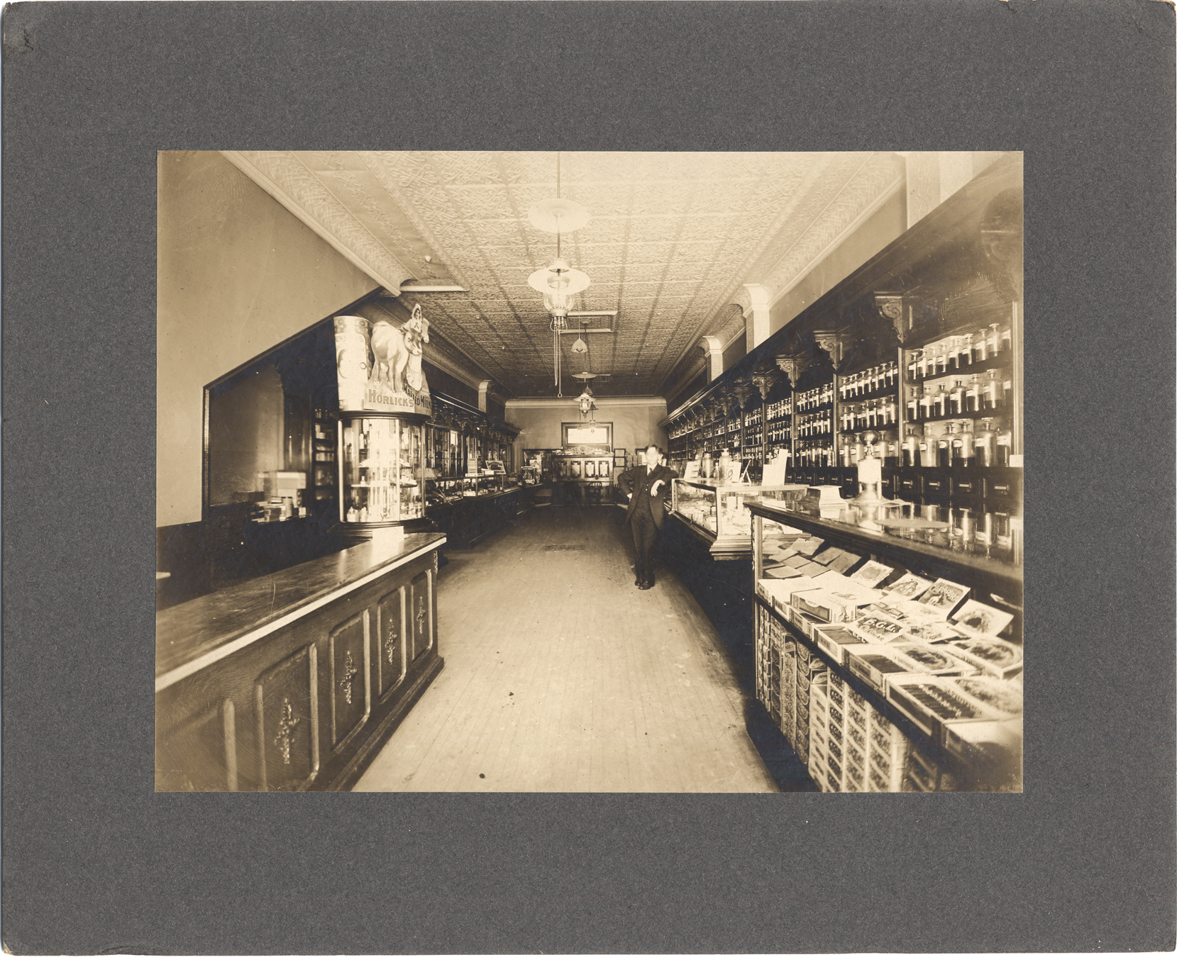 Geroge Gundrum in his drugstore. Handwritten on back: "George Gundrum drugstore."