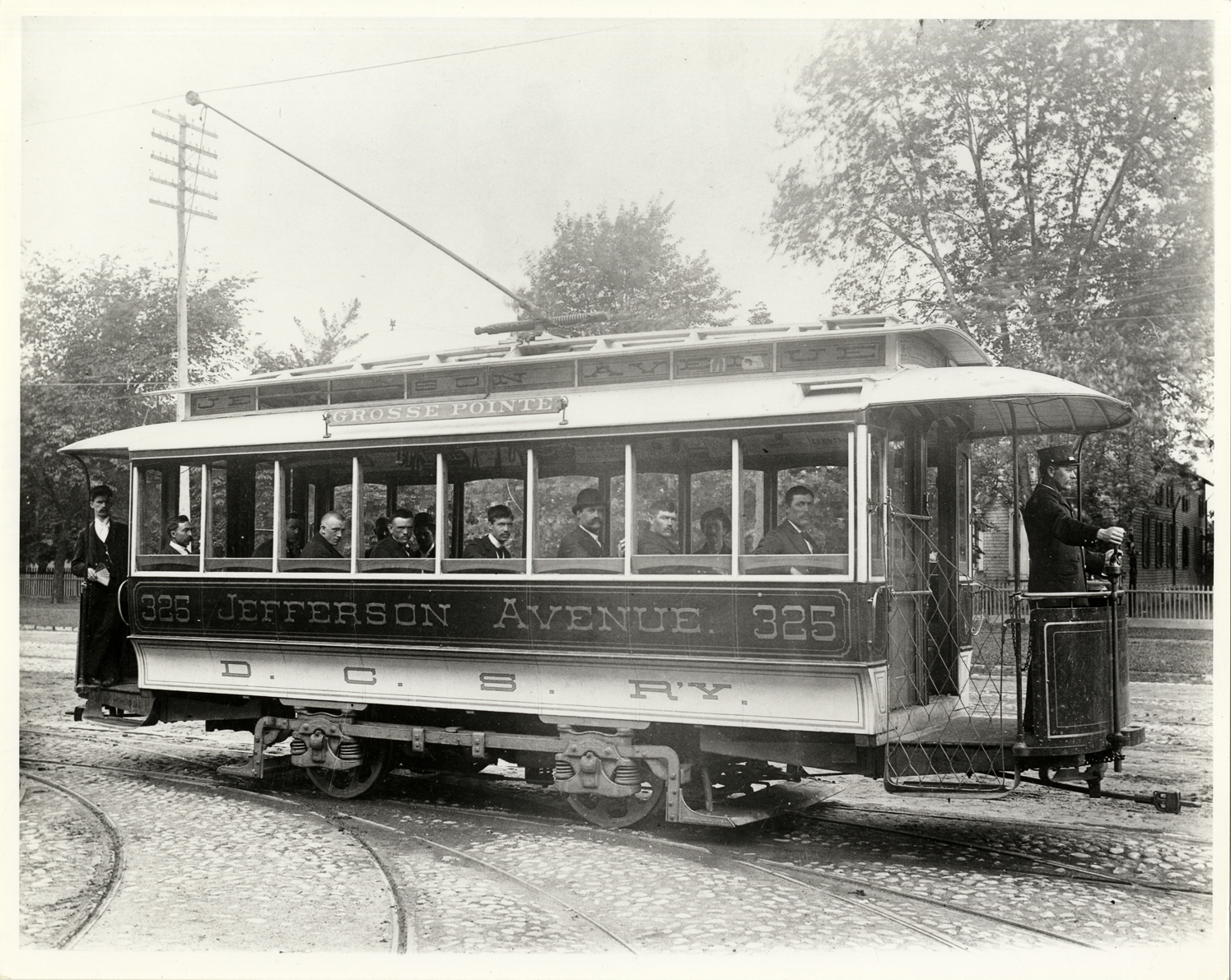 View of passengers and conductor on Jefferson Ave. streetcar no. 325. "Grosse Pointe, 325 Jefferson Avenue, D.C.S. R'Y" is painted on side of streetcar.