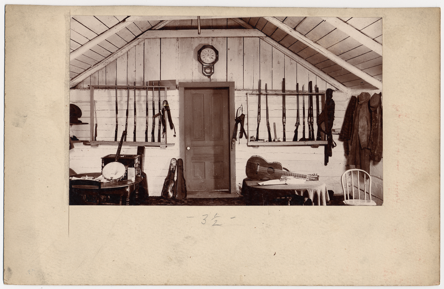 Interior view of a hunting lodge with rifles on shelves against back wall and musical instruments on tables and against back wall. Written on photo back: "The studio at Turtle Lake."
