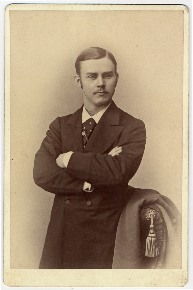 Portrait of a young man standing, arms folded across chest, with side part and mustache, wearing frock coat with large lapels and turned down collar with ascot. Printed on photo back: "C.C. Randall, photographer, 220 Woodward Ave., Detroit, class of '76, U. of M."