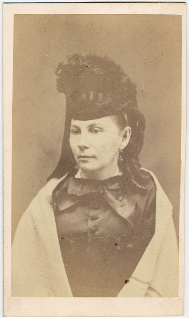Portrait of woman wearing earrings and hat with hair in curls falling to the shoulder, wearing a dark dress that buttons down the middle and a shaw around her shoulders. Printed on photo back: "Philip Engelhart, photographer, Michigan Avenue, Lansing, Mich."