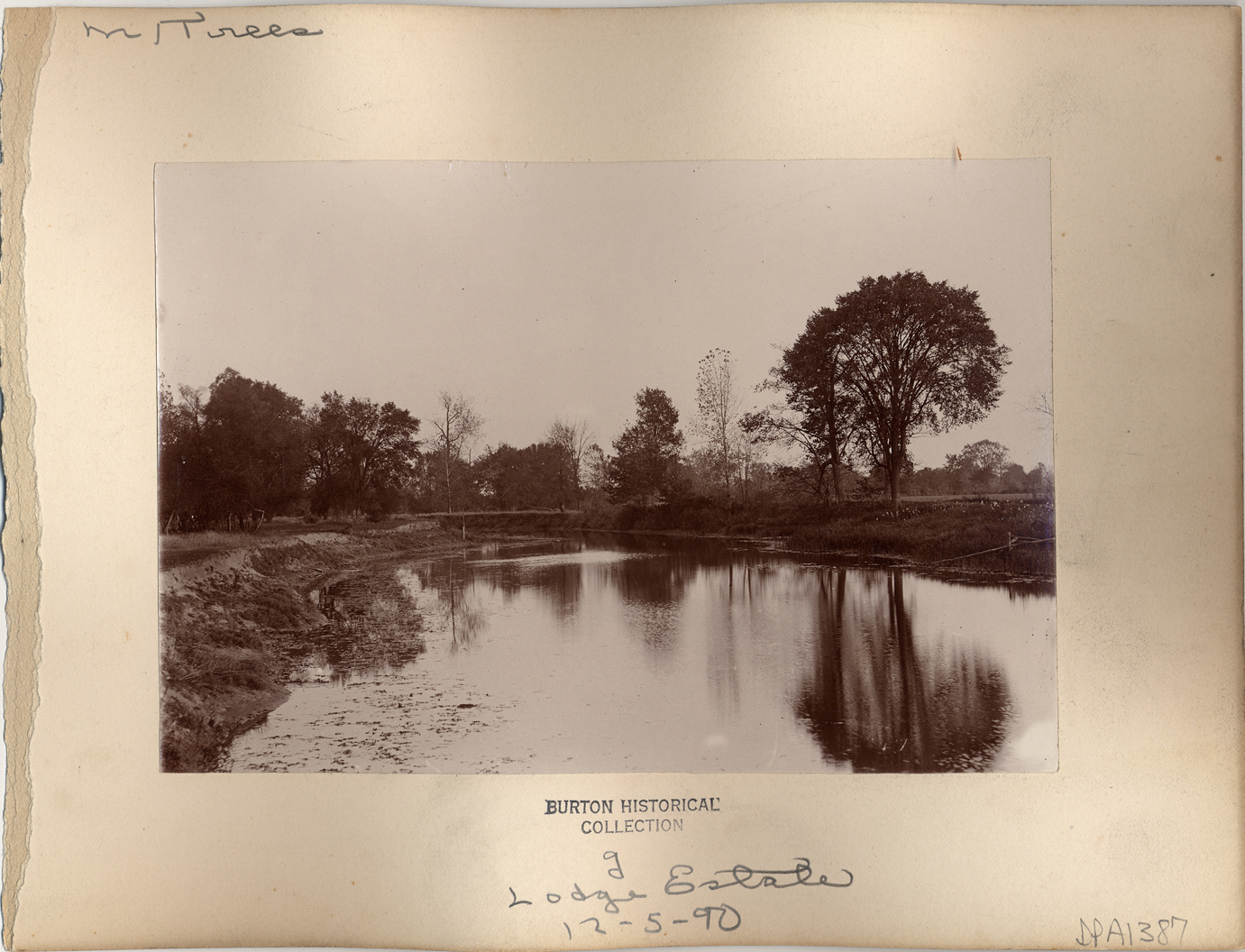Reflecting pond in parkland. Mixed deciduous trees. Handwritten on mat front: "Lodge Estate." Mat warped.