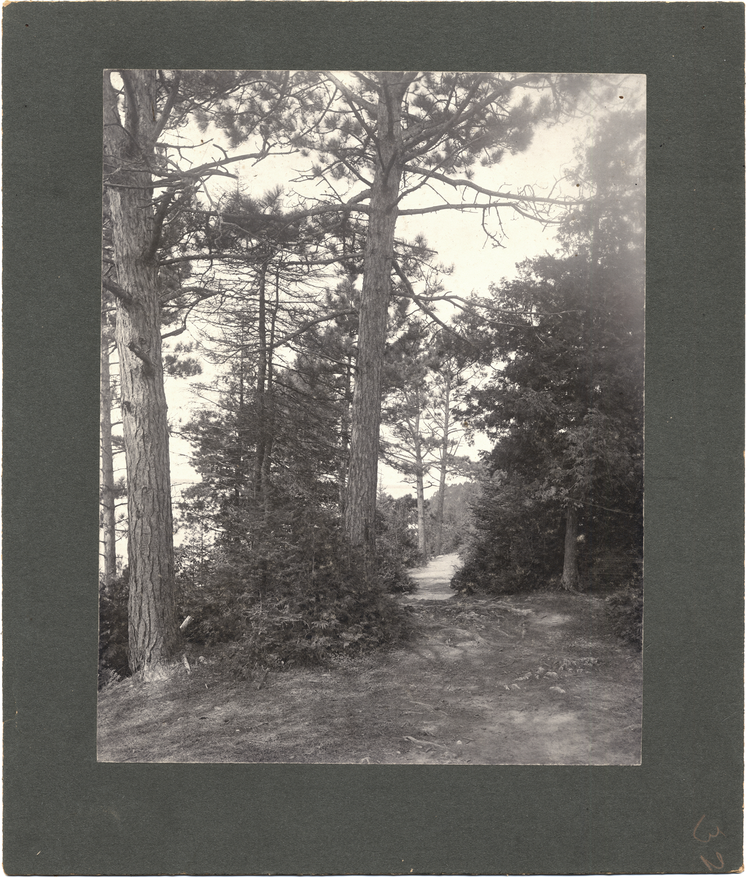 Winding unpaved road through pines. Stamped on mat back: "W.H. Gardiner, photographer, Detroit and Mackinac Island."