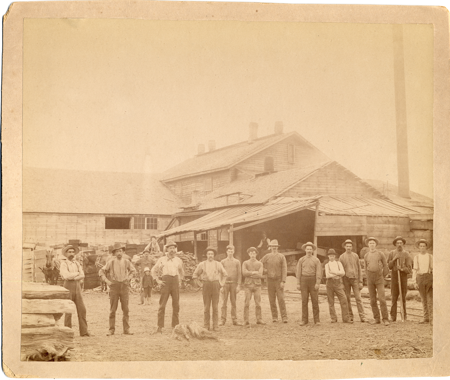 Men standing in front of sawmill. One child back near horse-drawn wagons. Logs and sawn lumber. Stamped on mat back: "Chapman Bros., Stanton, Mich., photographers."