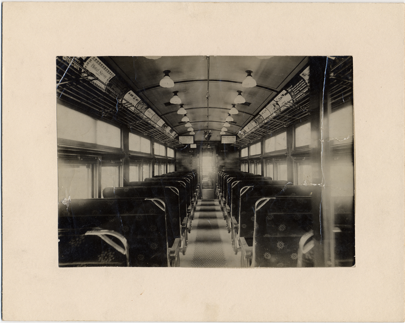 Interior of electric street-railroad car owned by Michigan United Traction Co. Handwritten on mat back: "Interior main passenger section, Mich. United Trac. Co., #27, Jackson, Mich., yr 1914."