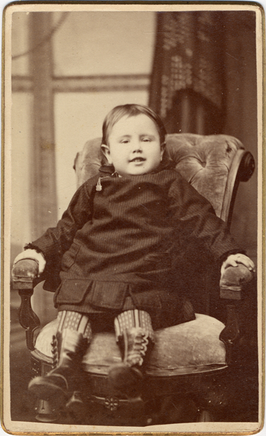 Portrait of a young child sitting in a velvet chair, wearing a dark dress, patterned stockings and boots with buckles. Printed on photo back: "Wm. Boswell, Excelsior Gallery, Flint, Mich."