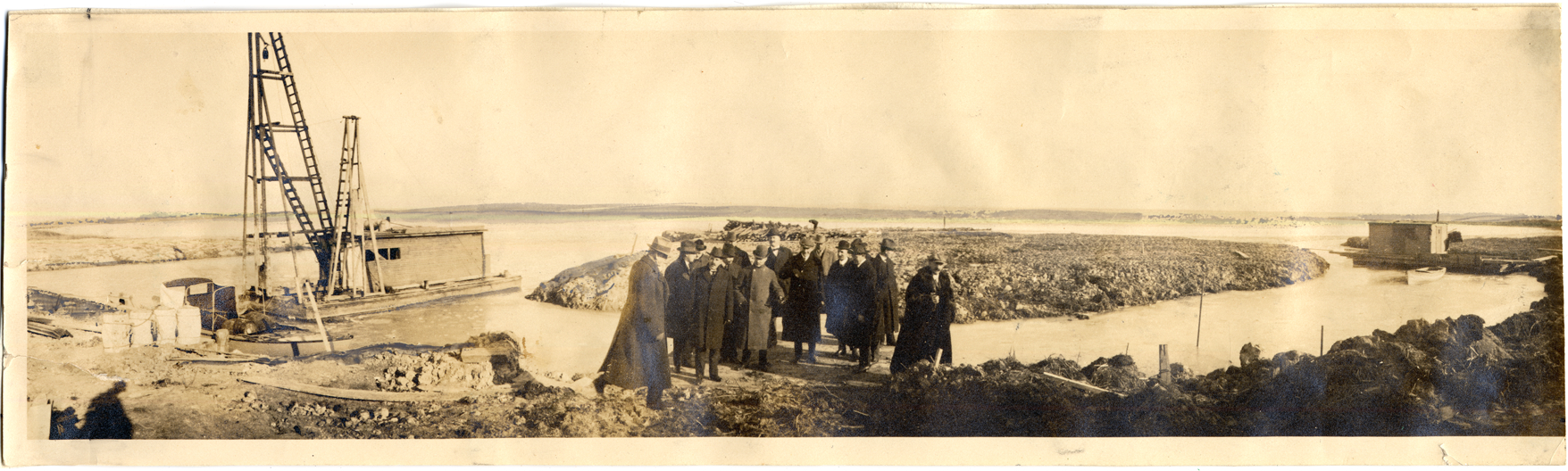 Group of overcoated men on shore of Anchor Bay. Dredger in operation. Island, boat, and boathouse in background.