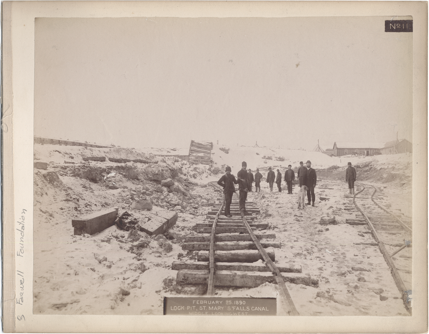 Construction site of St. Mary's Falls Canal lock pit with workers and dog on and near railroad tracks. Snow covers worksite, buildings in the background. Printed on front of photo: "No. 11, February 25, 1890, lock pit, St. Mary's Falls Canal, middle looking west."