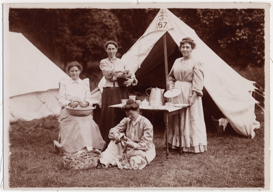 Two women standing behind table set in front of tent, two sitting in front of table. Each is posed with a dish or tool; one is cutting an onion. Laundry basket inside tent flap.