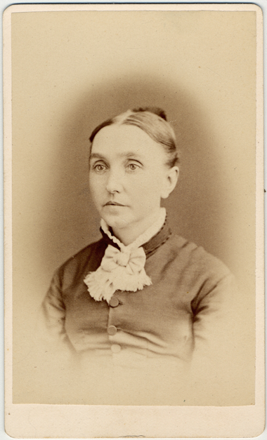 Vignette portrait of a woman, hair is parted in the middle and pulled back in a bun, feminine bow tie at throat of lace collar. Printed on photo back: "N.H. Cathcart, photographer, Flint, Mich., copies can be obtained from this negative by addressing me at Flint."