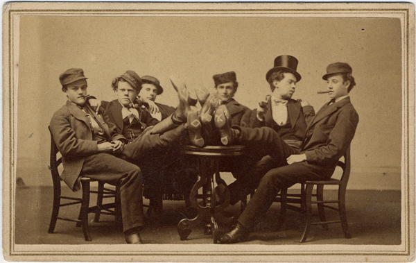 Six men, seated in wooden chairs around a small round table. Each has at least one foot on table, with symbols on soles. Four wear caps, two hats (one in full evening dress). Two have cigars, two have pipes. Handwritten on card back: "We are six."