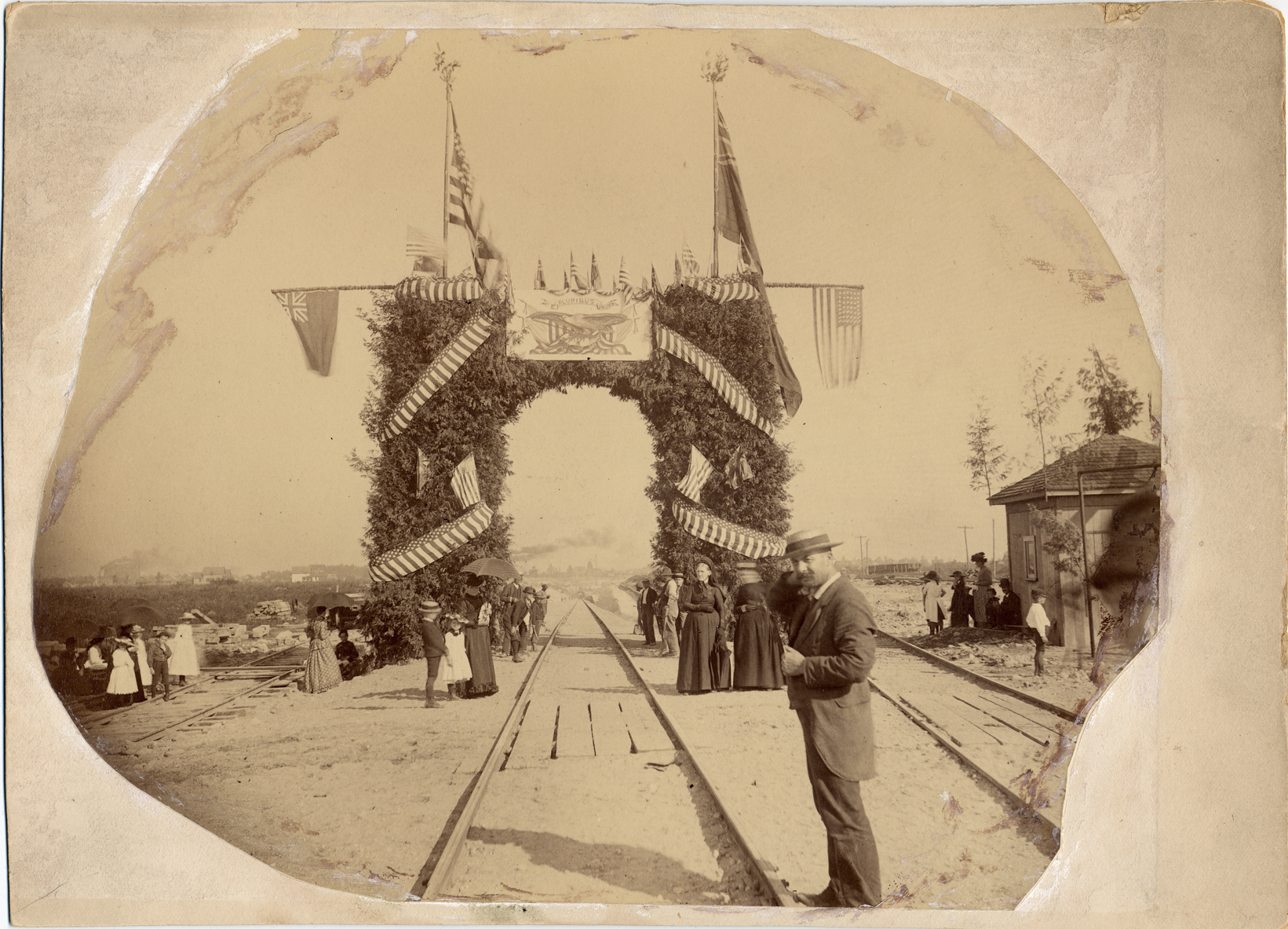 Opening of the St. Clair River Tunnel, the first railway tunnel to go under a river. Triumphal arch covered in branches, with U.S. and Canadian flags. Groups of people scattered on railway platform. Tunnel opening indistinct in distance. Handwritten on mat back: "St. Clair River Tunnel opening, 511." Photograph cut into roughly oval shape.