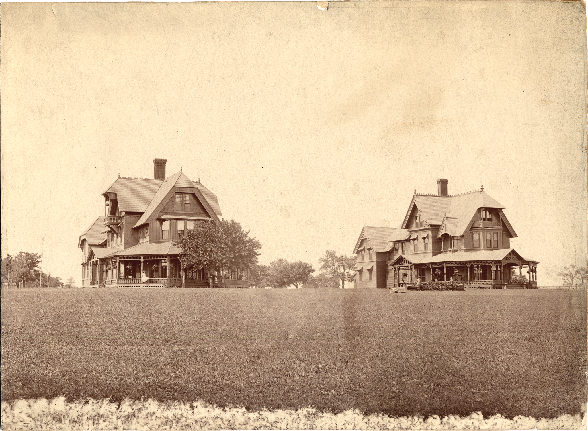 Mirror-image Victorian houses with gingerbread trim and wraparound porches. Handwritten on mat back: "H.B. Ledyard's, 1886, Hugh McMillan's, 1886, Grosse Pointe."