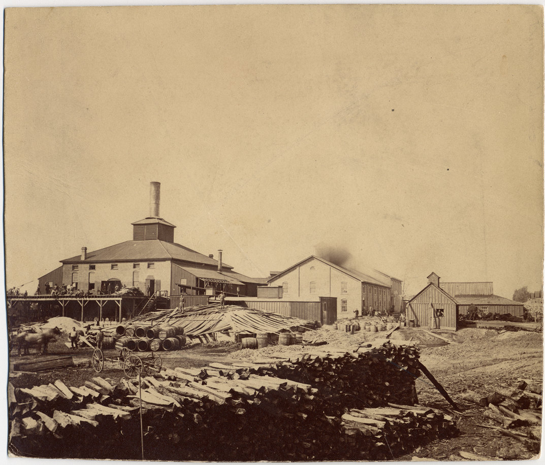 Sawmill yard with several buildings, piles of sawn lumber and logs. Sawmill workers next to buildings. Two horses with wagon.