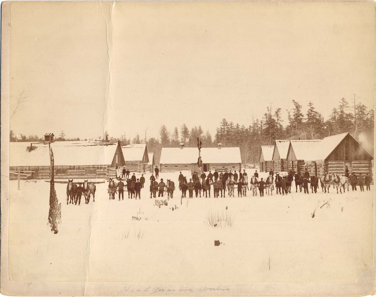 Large group of men in front of several log cabins in the snow. Ten yoked horse teams. Two men climbing pole. Handwritten on mat front: "Headquarters, Waters." Handwritten on mat back: "Henry Stephens camp at Waters, Mich."