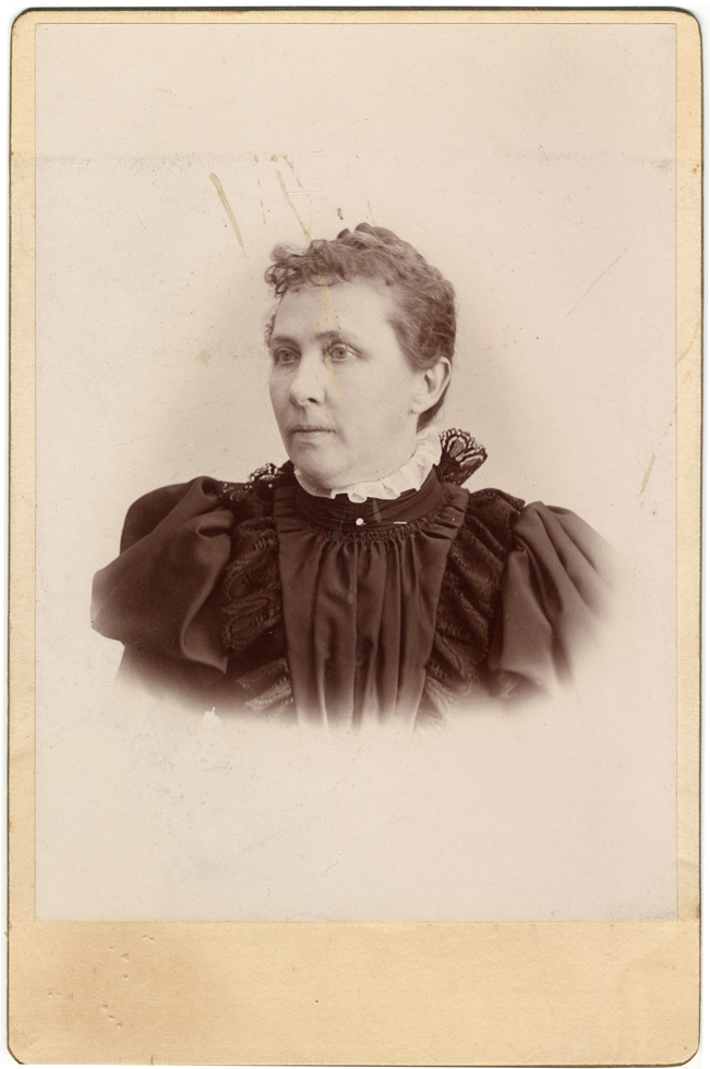 Portrait of a woman wearing a dark-colored dress with lace trim at the collar. Printed on photo back: "J.C. Murdock, photographer, Romeo, Mich."