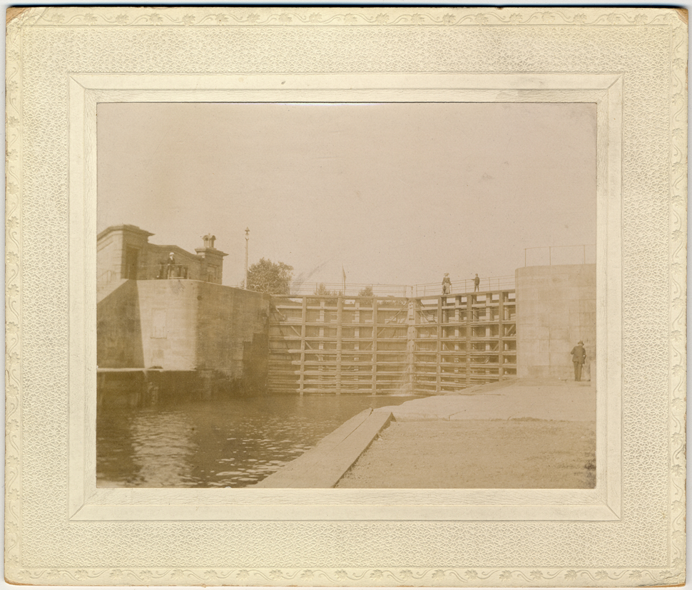 View of the Soo Locks and canal in Sault Ste. Marie. Man and woman standing on top of locks. Cement structures on both sides.