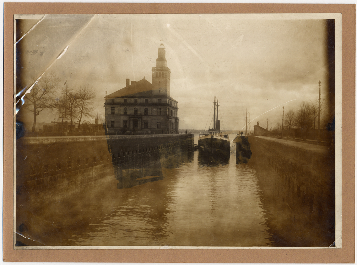 Small boat approaching lock on St. Mary's Falls Canal, Soo Locks, Sault Ste. Marie, Michigan. Large brick building with tower in corner on left side of canal. Photo has some color damage and has small rips in upper left corner.