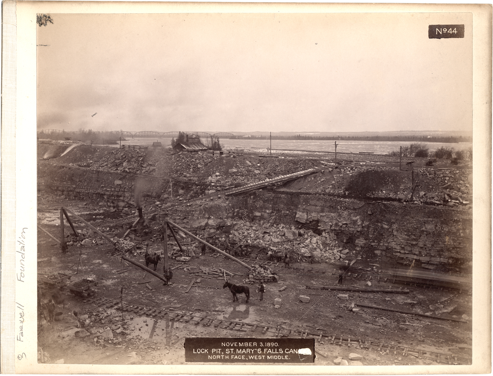 Construction site of St. Mary's Falls Canal lock pit showing railroad tracks, machinery, workmen, and horses. Water and bridge visible beyond pit edge. Steep railroad track from pit edge to floor. Printed on front of photo: "No. 44, November 3, 1890, lock pit, St. Mary's Fall Canal, north face, west middle."