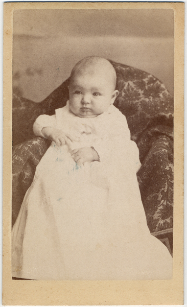 Portrait of an infant wearing a white dress leaning against patterned drapery. Printed on back of photo: "J.P. Rhodes, Reading, Michigan."