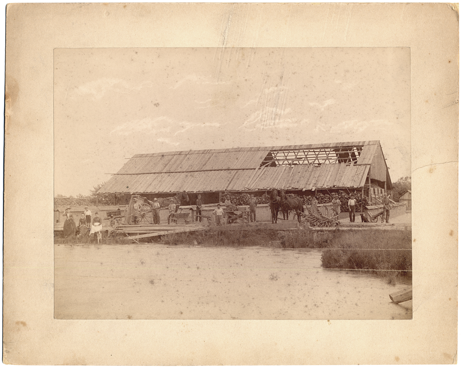 Group of people, including several women and a boy, in front of lumber shed. Three horses, two dogs, and several carts and barrows. Handwritten on mat back: "49-184, lumber shed, Hunt & Gable."